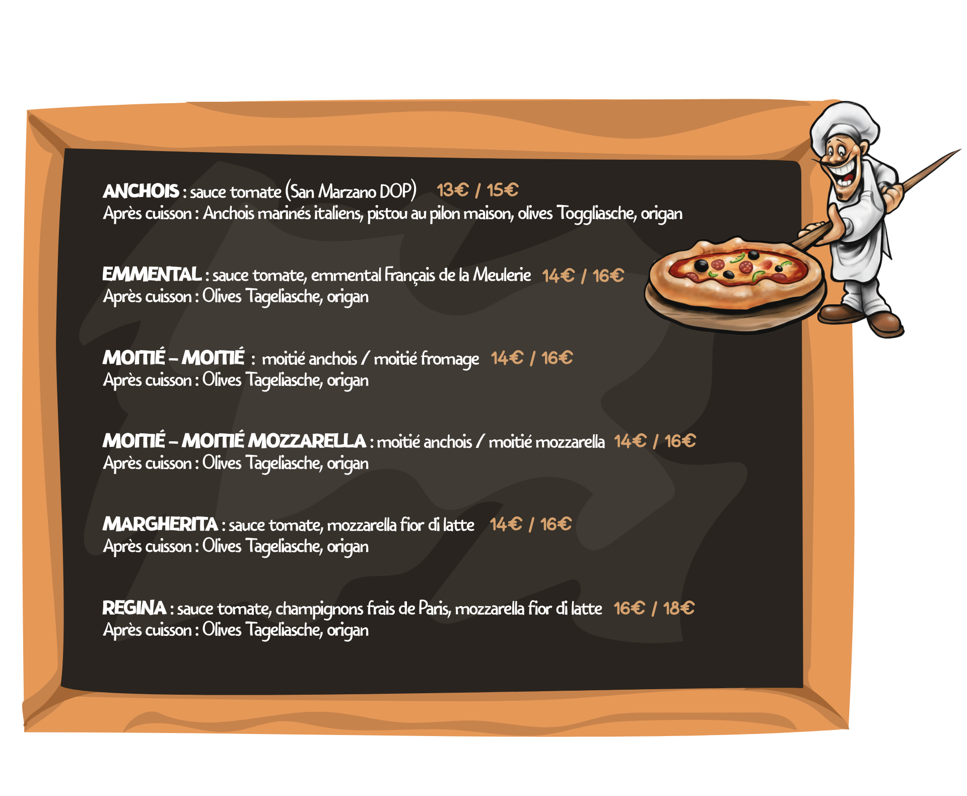 l’Anchois à la sauce tomate San Marzano, origan et olives Taggiasche, la Fromage, toute en douceur, à l’emmental de la Meulerie, et la fameuse Moitié-Moitié qui réconcilie toutes les tablées.